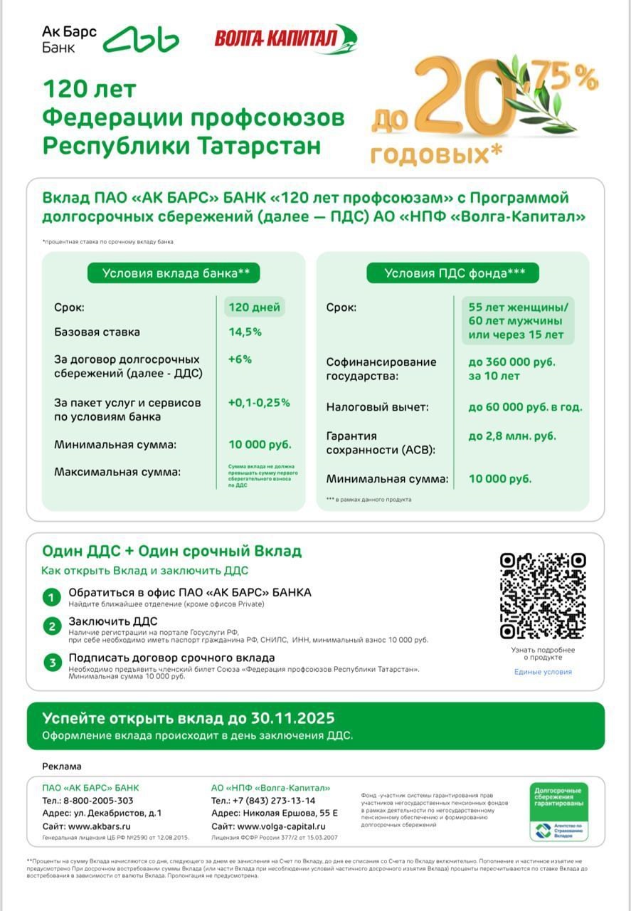 К 120-летию профсоюзов Республики Татарстан запущен специальный банковский продукт (вклад+программа долгосрочных сбережений). Программа позволяет открыть вклад со ставкой до 20,75% годовых. |