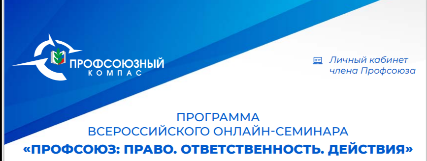 | 17-18 февраля состоится Всероссийский онлайн-семинар «Профсоюзный компас» по теме «Профсоюз: Право. Ответственность. Действия» в соответствии с примерной программой семинара. К участию приглашаются: профсоюзные лидеры и активисты региональных (межрегиональных), территориальных и первичных профсоюзных организаций (юридических лиц), территориальных профсоюзных организаций (без образования юридических лиц), первичных профсоюзных организаций. 17 февраля Начало работы Семинара –09.00 по мск. Продолжительность – 3 часа. Целевая аудитория: региональные (межрегиональные), территориальные и первичные профсоюзные организации (юридические лица). 18 февраля Начало работы Семинара – 09.00 по мск. Продолжительность – 3 часа 30 минут. Целевая аудитория: первичные профсоюзные организации ДФО и СФО. 18 февраля Начало работы Семинара – 14.30 по мск. Продолжительность – 3 часа 30 минут. Целевая аудитория: первичные профсоюзные организации ЦФО, ПФО, УФО, СЗФО, СКФО, ЮФО.